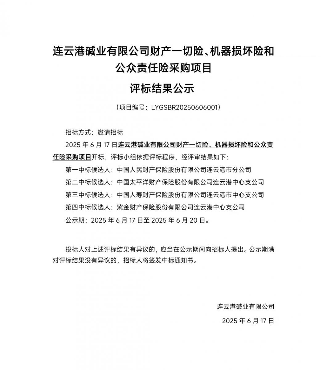 連云港堿業(yè)有限公司財(cái)產(chǎn)一切險(xiǎn)、機(jī)器損壞險(xiǎn)和公眾責(zé)任險(xiǎn)采購項(xiàng)目評標(biāo)結(jié)果公示