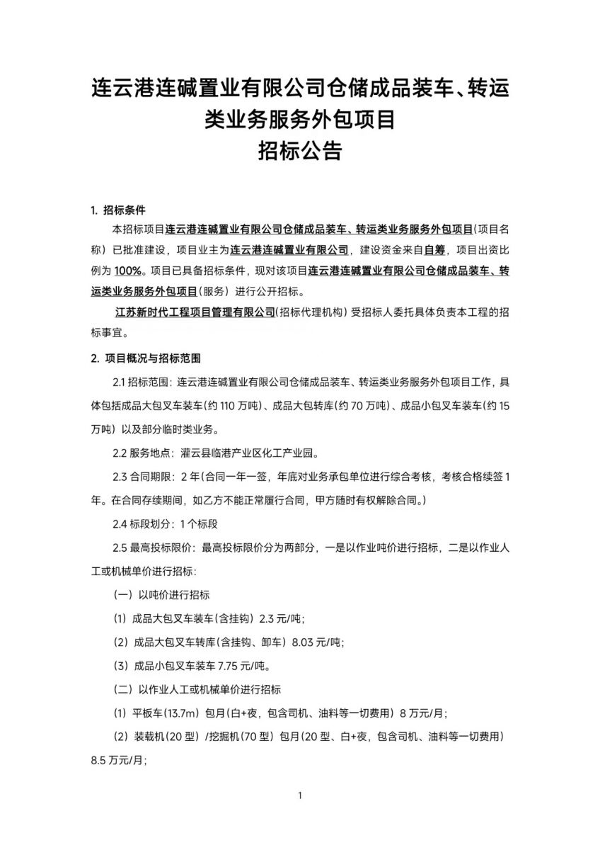 連云港連堿置業(yè)有限公司倉(cāng)儲(chǔ)成品裝車(chē)、轉(zhuǎn)運(yùn)類(lèi)業(yè)務(wù)服務(wù)外包項(xiàng)目招標(biāo)公告