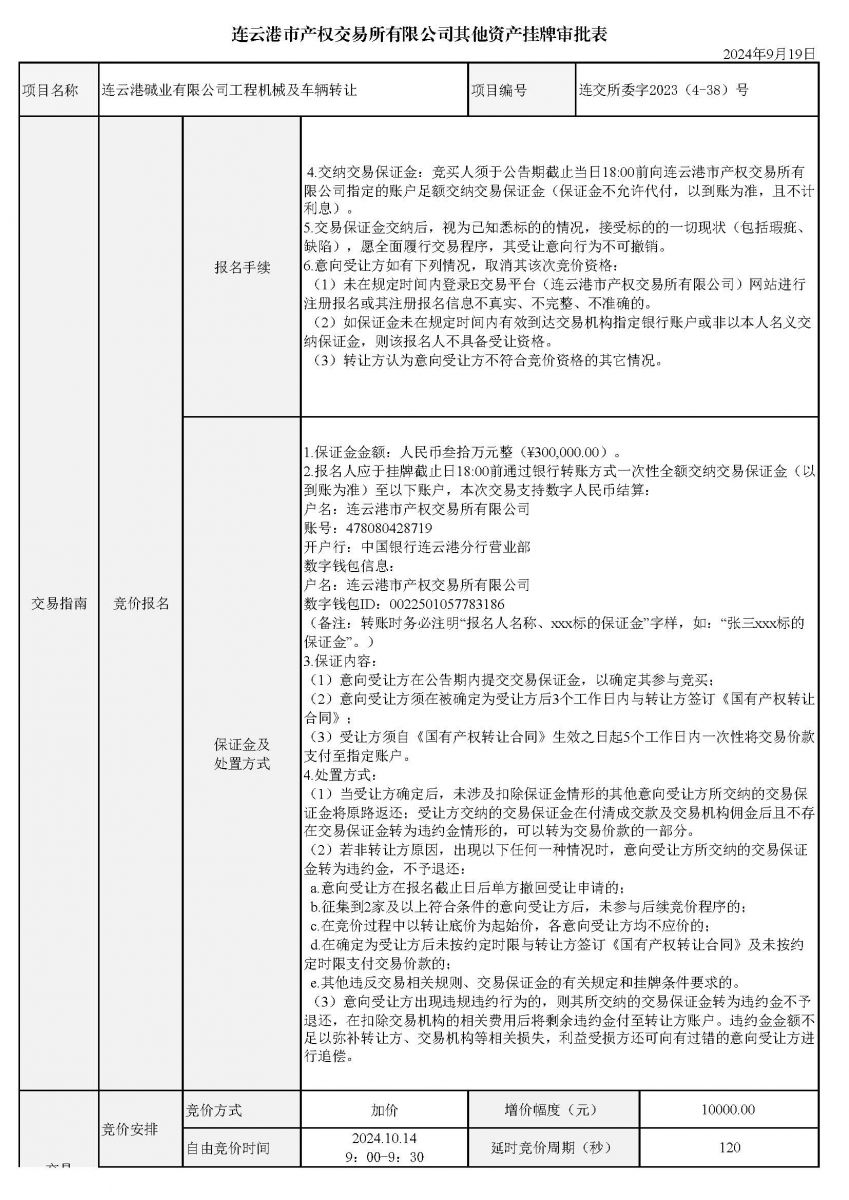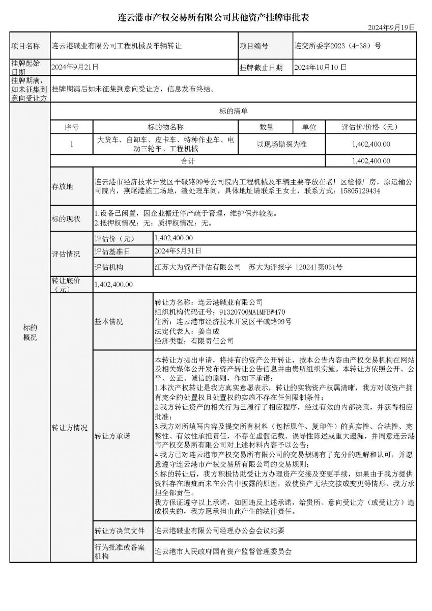 連云港堿業有限公司工程機械及車輛轉讓資產掛牌審批表