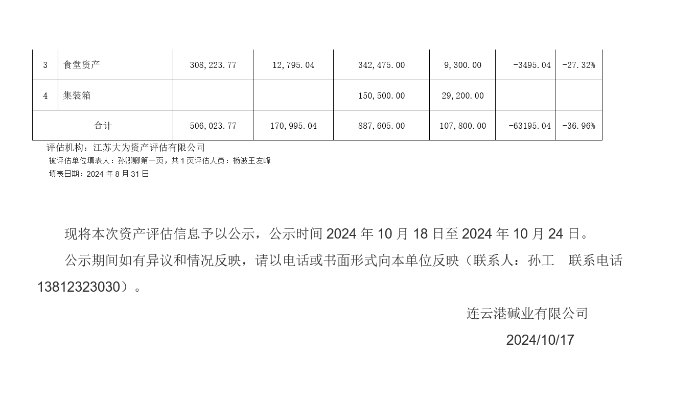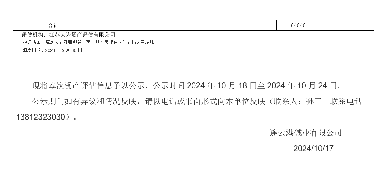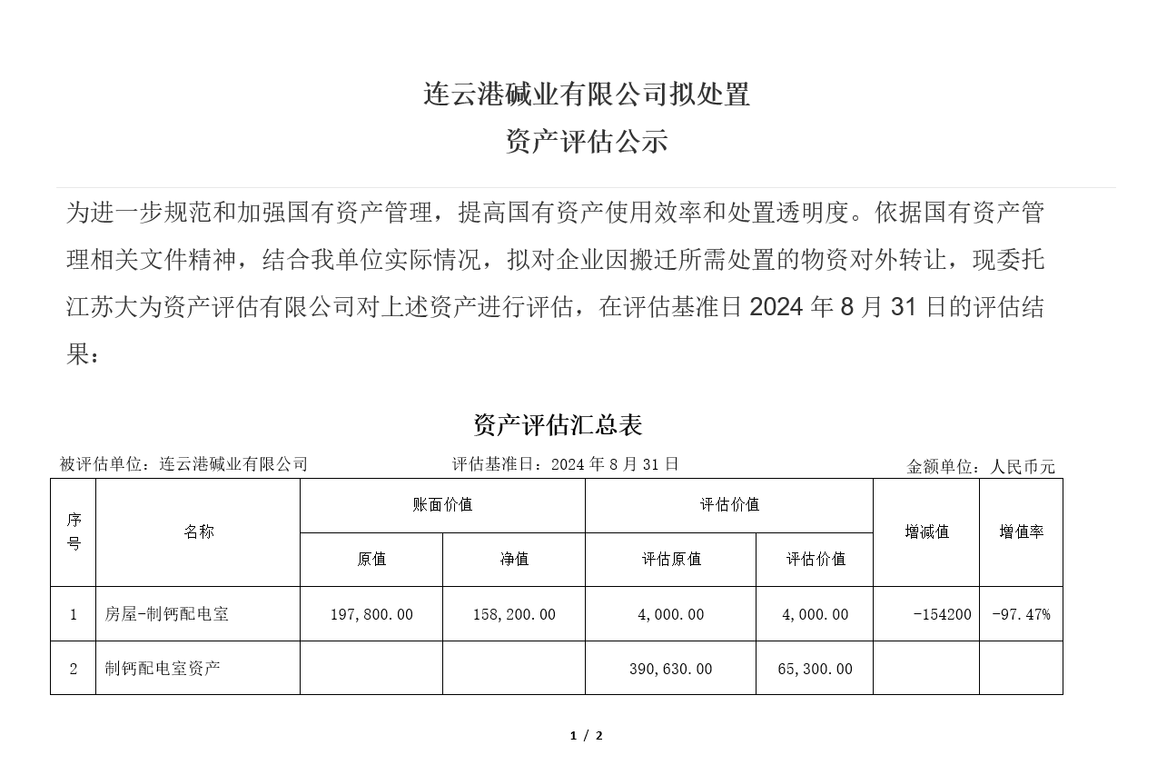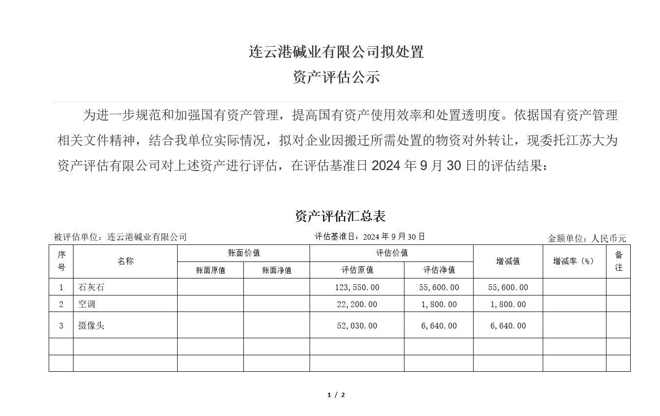 連云港堿業有限公司老廠區食堂等廢舊物資資產評估公示