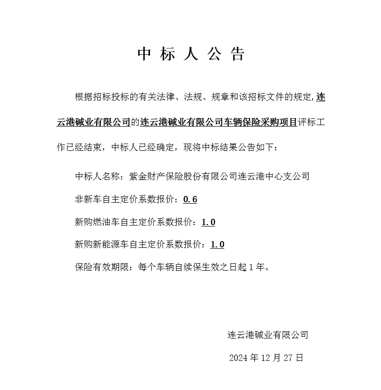 連云港堿業有限公司車輛保險采購項目中標人公告